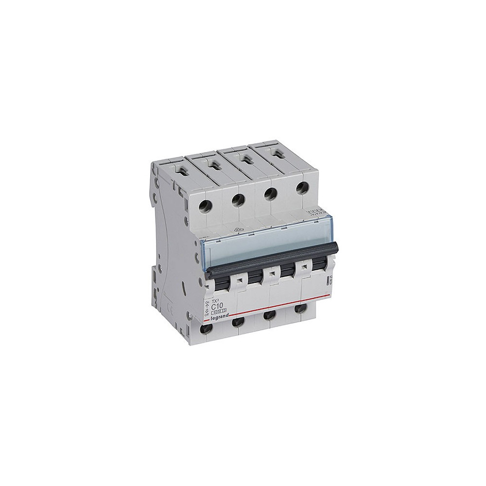Interruptor automático Magnetotérmico Legrand de 4 Polos y 10A, con curva de disparo C, ideal para protección eléctrica en instalaciones residenciales y comerciales. Cumple con la norma EN/IEC 61008-1.