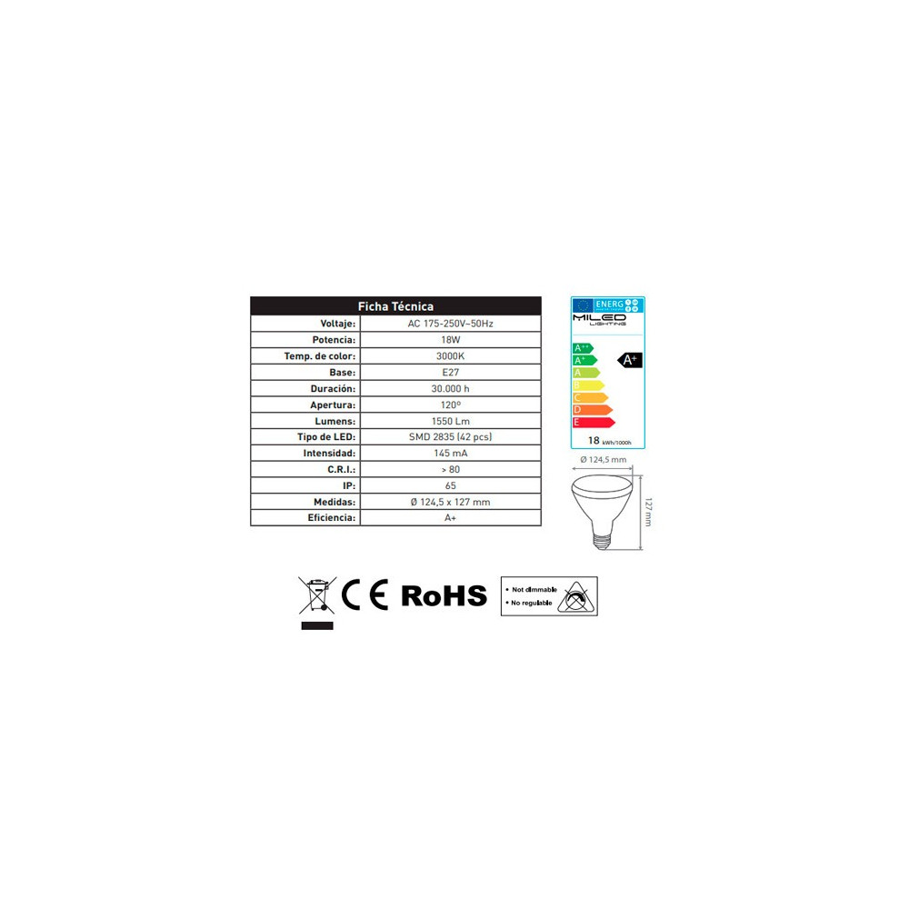 La bombilla LED E27 PAR38 de 18W proporciona 1550 lúmenes de luz cálida 3000K, ideal para ambientes que requieren una iluminación acogedora y potente. Su ángulo de apertura de 120º y protección IP65 la hacen perfecta para uso en exteriores.