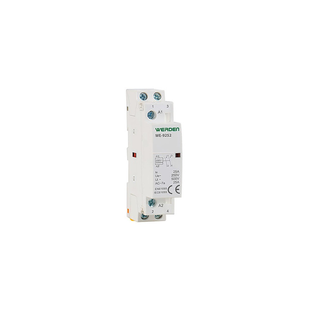 El Contactor Modular de 1 módulo - 2 Polos x 25 A de Werden es perfecto para tus instalaciones eléctricas. Con una potencia de 5.5 kW, ofrece un control confiable y eficiente, adecuado para uso residencial, comercial e industrial. Su estructura compacta asegura una fácil integración en carriles DIN.
