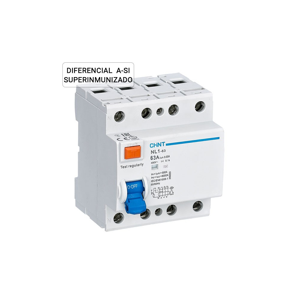 Interruptor Diferencial tipo A-SI SuperInmunizado de 4 Polos, 63A y 30mA, de CHINT, diseñado para garantizar seguridad y eficiencia en cualquier entorno. Este dispositivo ofrece protección superior contra corrientes residuales y interferencias transitorias.
