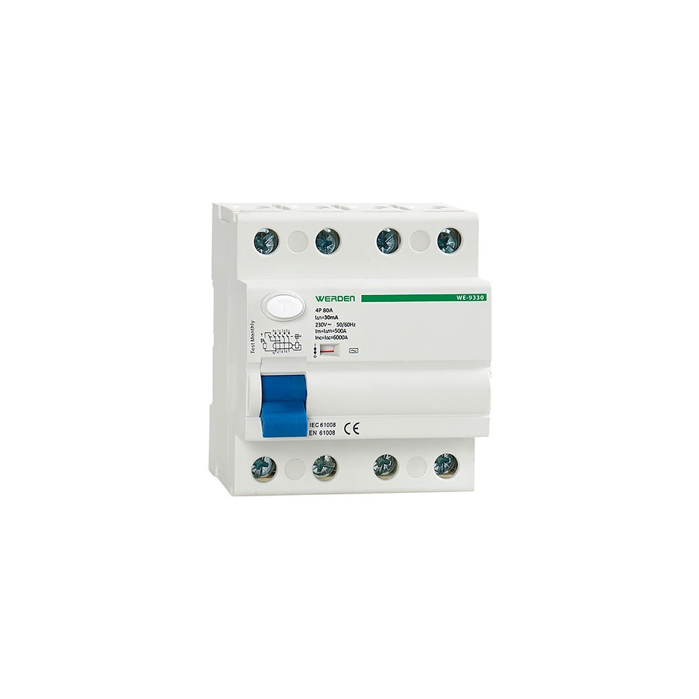 El diferencial eléctrico trifásico Werden tipo AC de 4 polos, con una intensidad nominal de 80A y una sensibilidad de 30mA, garantiza una protección eficaz en instalaciones eléctricas de alta demanda. Detecta fugas mínimas de corriente, evitando accidentes eléctricos.