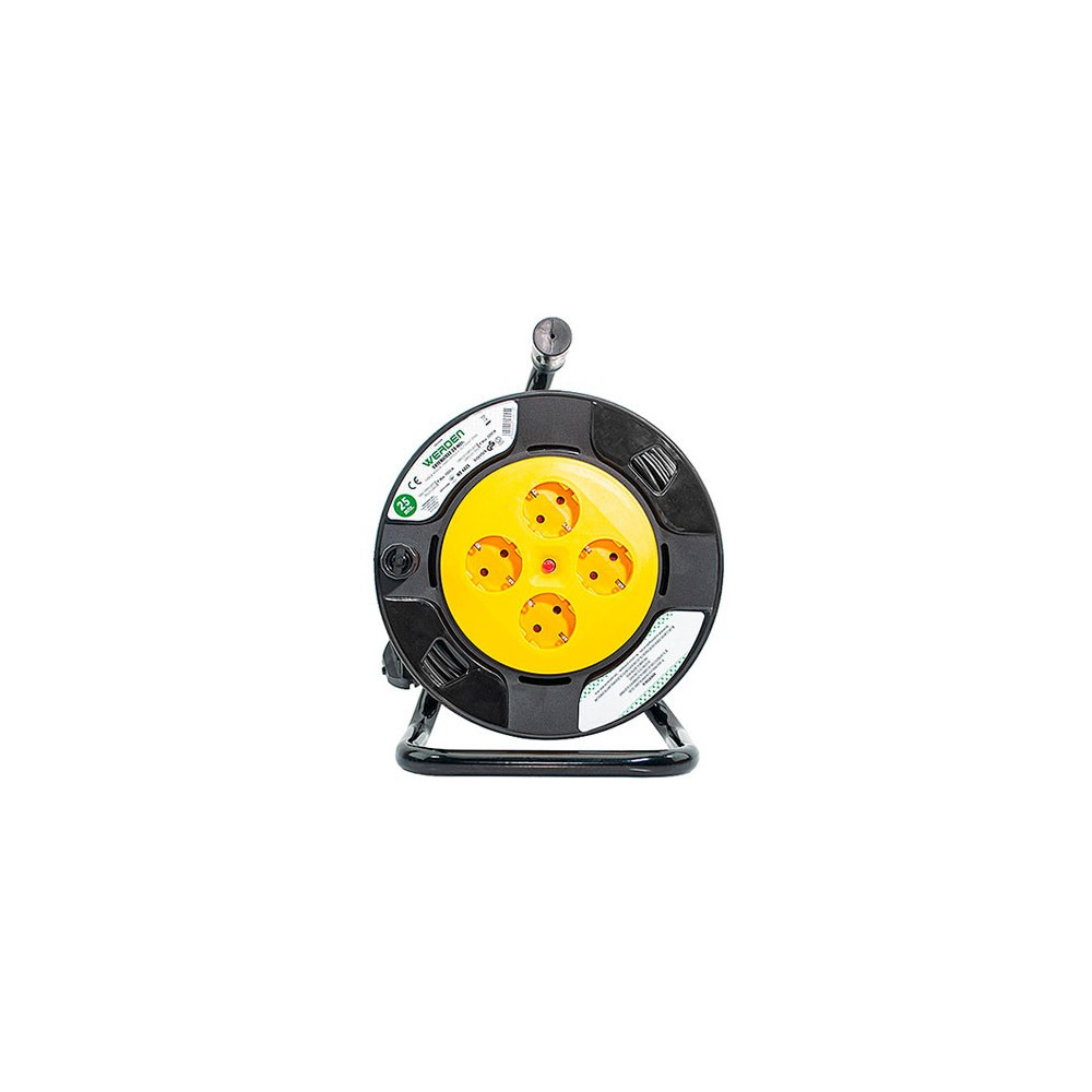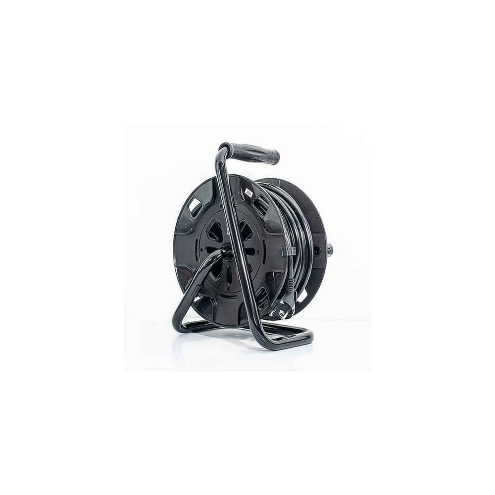 Enrollacable alargador de 25 metros con 4 enchufes, ideal para trabajos que requieren una extensión segura y cómoda. Su diseño de protección térmica garantiza un uso seguro y duradero, mientras que el soporte metálico y el asa de transporte facilitan su manejo.
