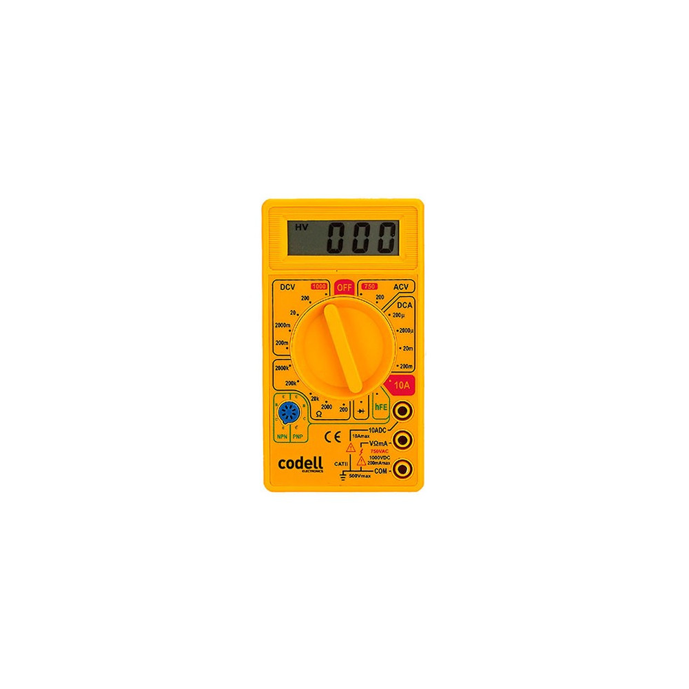 - Multímetro digital AC/DC con indicación automática para medir voltaje, corriente y resistencia. Equipado con pantalla LCD y cables para uso inmediato.