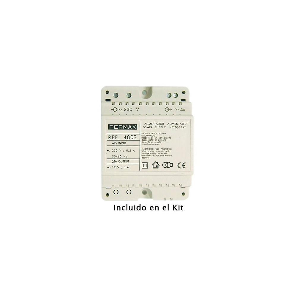 Fermax 4848: Placa CITYLINE 4+N 4AP104 con caja de empotrar (ref. 8949). Permite la comunicación eficaz entre el acceso del edificio y las viviendas, facilitando la apertura de puertas y la llamada a conserje. Placa de calle S4: 130 mm (alto) x 199 mm (ancho). Caja de empotrar S4: 115 mm (alto) x 185 mm (ancho) x 45 mm (profundidad). Fermax 3426: Cuatro teléfonos VEO 4+N. Terminales de audio en las viviendas para comunicación con la placa de calle y control de apertura de puertas. Fermax 4802: Alimentador 12Vac/1A DIN4, para alimentar los dispositivos del sistema. Construidos con material autoextinguible VO para mayor seguridad y durabilidad. Referencia del Kit: FERMAX CITY 4+N 4864