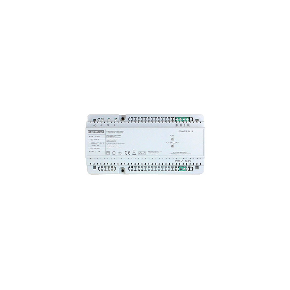 Fermax 4825: Alimentador con filtro 24VDC-2.5A DIN10. Fuente de alimentación con filtro para sistemas DUOX PLUS, entrada 100-240Vca y salida 24Vcc/2.5A, con montaje en carril DIN10.